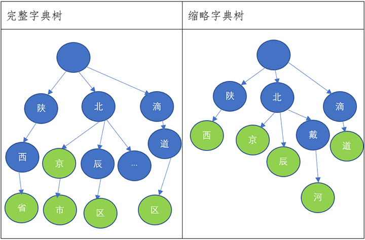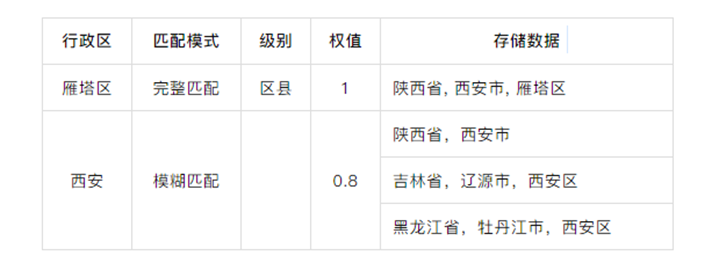 舉例:在完整字典樹中北辰區(qū)節(jié)點存儲:天津,天津市,北辰區(qū);在縮略字典樹中西安節(jié)點存儲:陜西省,西安市&吉林省,遼源市,西安區(qū)&黑龍江省,牡丹江市,西安區(qū)。