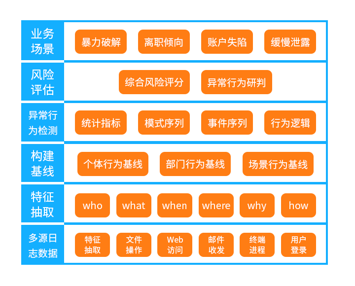 基于大數據驅動、安全分析和機器學習,通過刻畫用戶行為,將內部違規操作、竊取數據、非法刪除等異常行為與正常行為進行關聯分析,通過行為建模,準確地描述出行為細節,從而提高了命中異常事件的準確率,彌補了傳統安全防控無法有效監測內部威脅的不足。