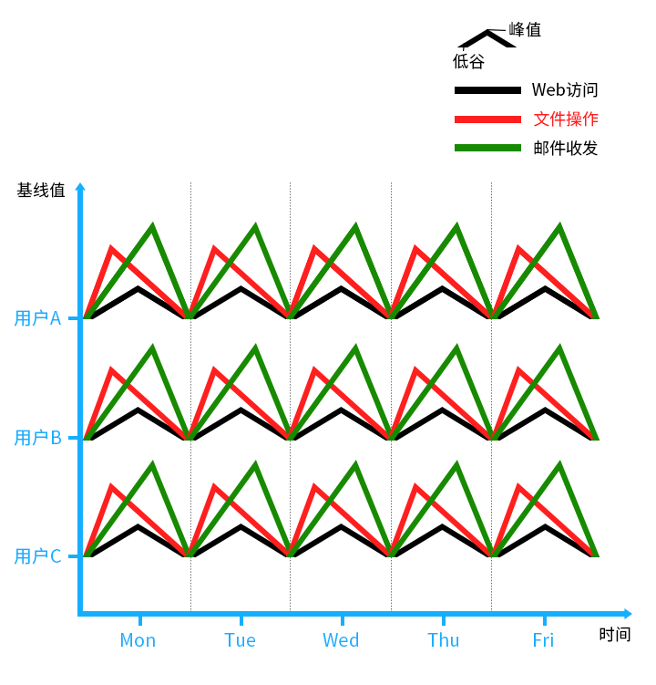 △ 本圖展示了3個用戶的個體行為基線,包括郵件收發、文件操作和web訪問三個業務操作場景。將用戶行為進行縱向分析計算,可得到部門行為基線。