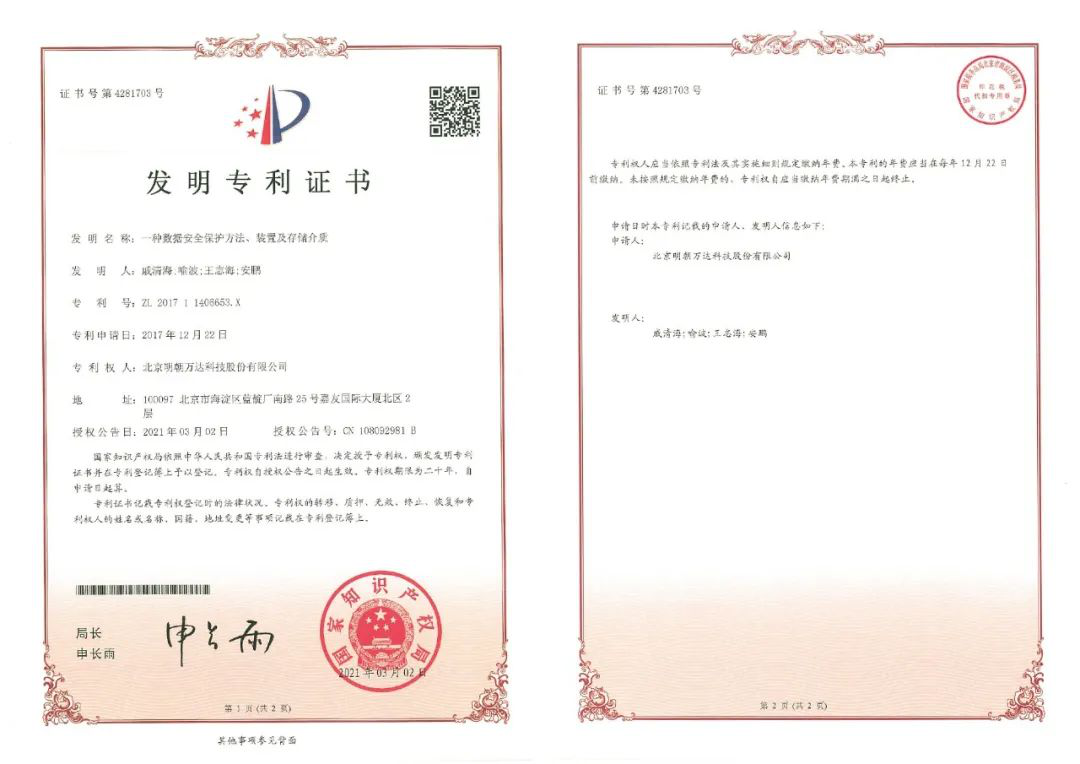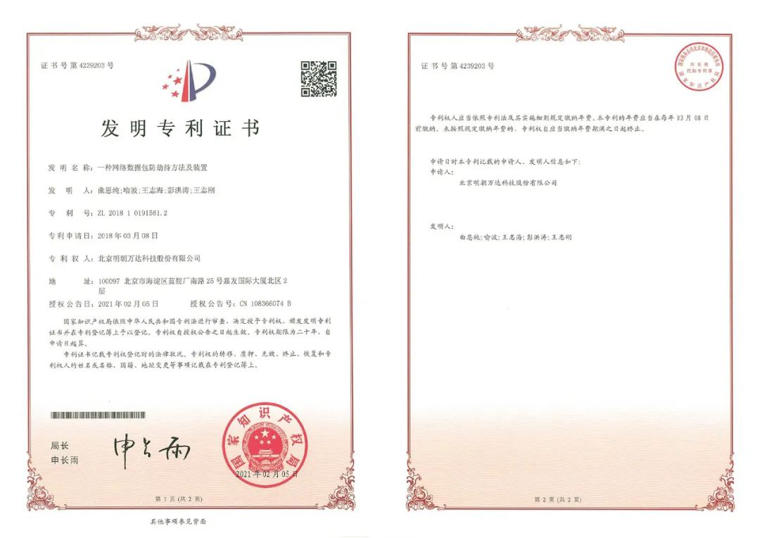 作為中國新一代信息安全技術企業的代表廠商,明朝萬達始終堅持將技術創新作為企業發展的核心推動力,打造了一支由清華大學博士和碩士為骨干力量的研發團隊,支撐起公司強大的自主知識產權體系與核心競爭力。截止目前,公司已申請發明專利300余項,授權專利近140項。