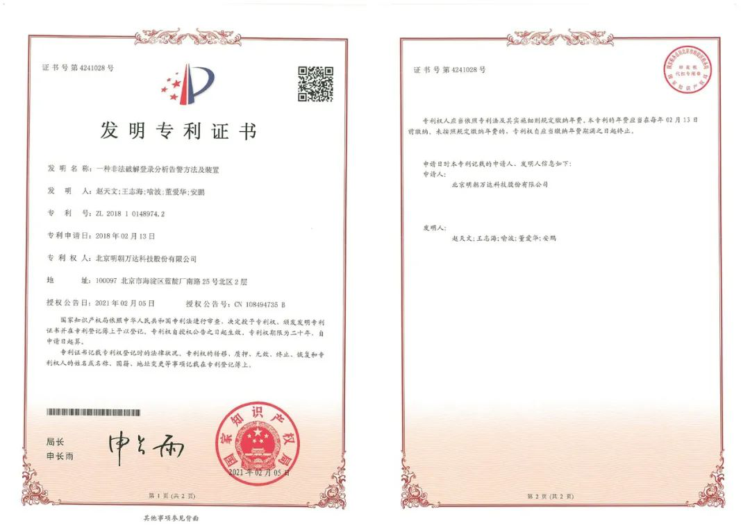 近日,明朝萬達自主研發的“一種不可信搜索路徑漏洞的檢測方法及系統”、“數據監測方法和裝置”、“一種非法破解登錄分析告警方法”、“一種數據管理方法和裝置”4項創新技術順利通過了國家知識產權局的嚴格審查,正式獲得了由國家知識產權局頒發的發明專利證書。