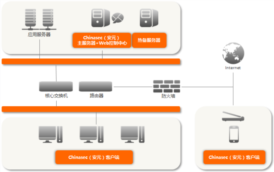 本方案采用了明朝萬(wàn)達(dá)自主研發(fā)的Chinasec(安元)數(shù)據(jù)安全管理系統(tǒng),通過(guò)認(rèn)證、監(jiān)控、審計(jì)、阻斷和加密等手段為辦公終端提供全方位的數(shù)據(jù)安全保護(hù)。