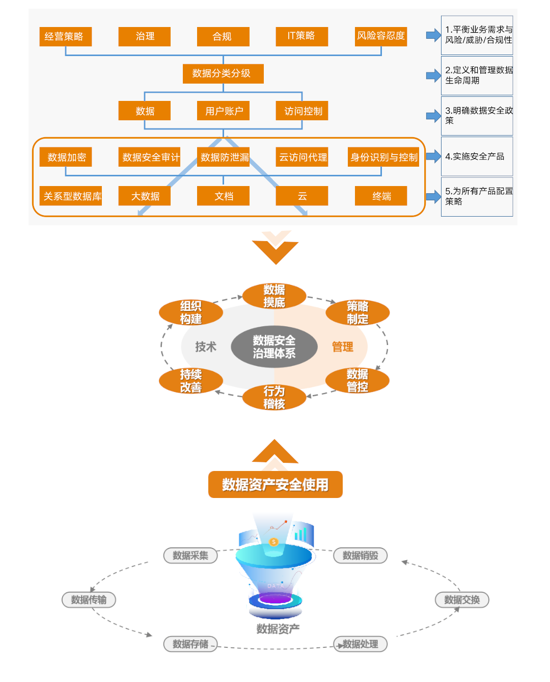 該方法論參考Gartner數據安全治理框架,形成適用于國內現狀的數據安全治理體系,真正做到管理指導技術、技術支撐管理,管理和技術有機結合。從數據全生命周期進行分析梳理,以數據資產安全合理使用基礎,形成數據安全治理體系。