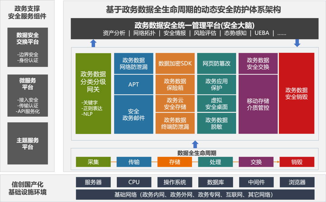 作為專業信息安全廠商,明朝萬達依據《中華人民共和國數據安全法》、GB/T 39477—2020《信息安全技術 政務信息共享 數據安全技術要求》等相關政策法律法規的要求,基于信創背景下的國產化安全需要,結合政府機構數據安全管理現狀及對政務數據安全需求的分析,充分利用公司成熟的數據安全技術成果,開辟出一條以數據為核心的全生命周期安全管控新思路,提出了一套可滿足政府機構數據融合和對外開放共享要求的安全解決方案。