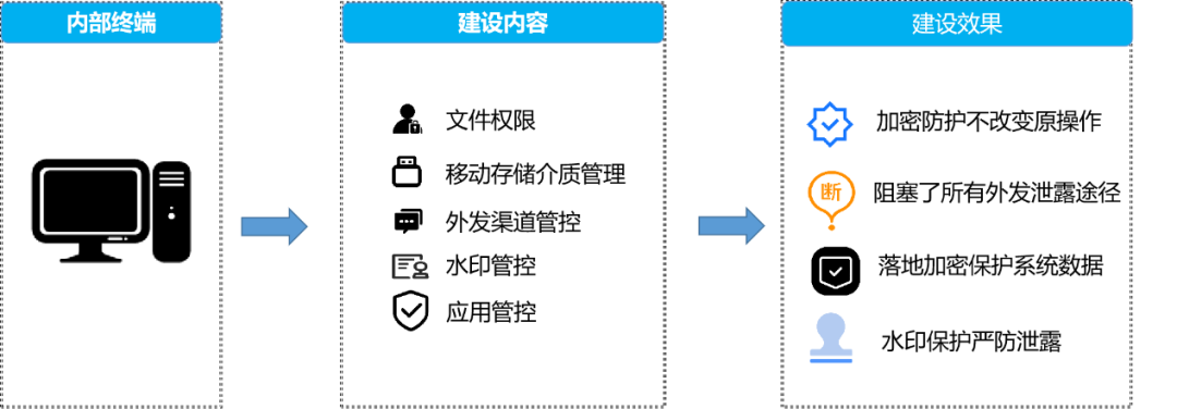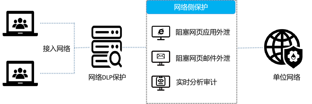 其中,終端數據防泄漏平臺通過監測終端設備的網絡流量運行的軟件USB接口等實時發現發送、上傳、拷貝、轉移數據文件等行為,掃描文件是否包含禁提供或披露的數據進而實時告警或阻斷;網絡防泄漏平臺則能夠實時監測通過HTTP、HTTPS進行外發的各項內容,對敏感、高密級的內容進行相應的審計、阻斷、審批等防護手段,可以有效防范內部人員竊取、泄漏數據的風險同時有助于安全事件發生后的溯源取證。
