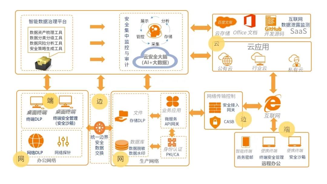 對終端認證、加密、監(jiān)控和追蹤等手段,在傳統(tǒng)PC終端提供數(shù)據(jù)保護、文檔加密、應用保護、系統(tǒng)管理、桌面管理和安全通訊等方面的安全防護,敏感數(shù)據(jù)提供全生命周期的安全管理和審計,安全防護貫穿于數(shù)據(jù)產(chǎn)生、訪問、傳輸、使用和銷毀的過程中,實現(xiàn)事前安全管理、事后行為審計;對部署在企業(yè)外網(wǎng)出口,能對捕獲的企業(yè)網(wǎng)絡數(shù)據(jù)進行內容檢測,以防止企業(yè)敏感數(shù)據(jù)傳輸?shù)狡髽I(yè)外部。以“內容識別”指對企業(yè)網(wǎng)絡出口的數(shù)據(jù)包進行會話重組與文件恢復后獲取內容,對敏感內容進行識別,實現(xiàn)外發(fā)數(shù)據(jù)的審計和敏感數(shù)據(jù)的阻斷;對用戶數(shù)據(jù)上云加密,下載本地自動解密主要功能,防止核心數(shù)據(jù)直接暴露或者傳輸過程中被竊取,確保企業(yè)重要業(yè)務云的數(shù)據(jù)安全保護及云業(yè)務系統(tǒng)的攻擊防護;對互聯(lián)網(wǎng)傳播泄露的監(jiān)測和溯源,提供監(jiān)測規(guī)則(如關鍵字、正則表達式、文檔指紋、文檔特征等),發(fā)現(xiàn)敏感數(shù)據(jù)或文檔泄露將及時通過短信或者郵件的方式發(fā)出預警,同時自助查詢特定網(wǎng)站是否存在數(shù)據(jù)泄露;對關鍵信息基礎敏感數(shù)據(jù)通過數(shù)據(jù)安全一體化管控平臺對終端、網(wǎng)絡、邊界、云端側建立縱向防控安全體系。