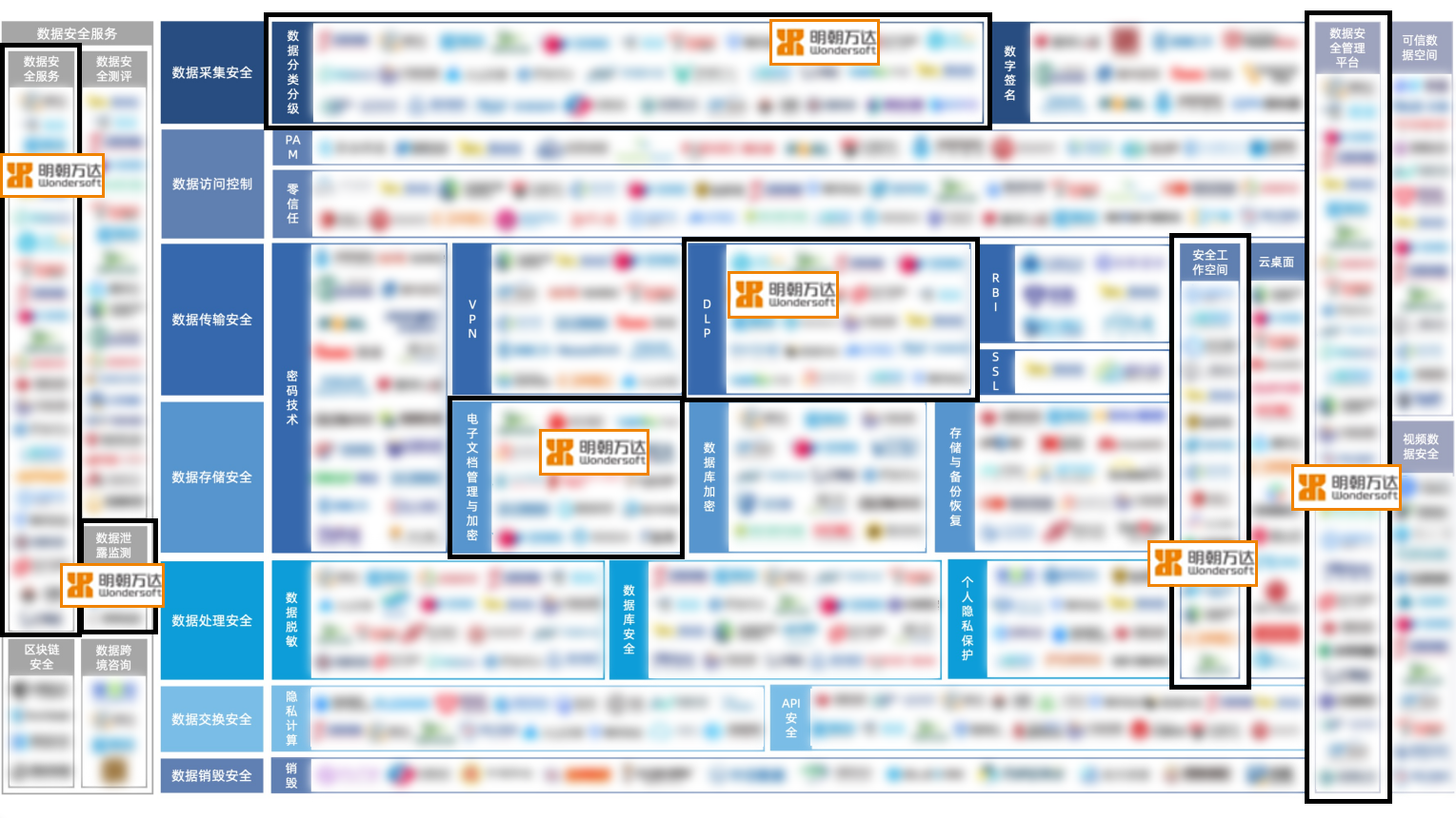 該報告中的數據安全市場全景圖,作為數據安全領域的重要參考,涵蓋了數據安全市場的各個領域與關鍵環節。全景圖的評選標準極為嚴格,不僅要求廠商具備領先的技術創新能力與深厚的行業積累,還需在市場占有率、客戶口碑、品牌影響力等方面表現出色。明朝萬達憑借過硬的技術實力和突出的市場表現,上榜數據安全服務、數據泄露檢測、數據分類分級、安全工作空間、DLP、電子文檔管理與加密、數據安全管理平臺7項領域代表廠商。