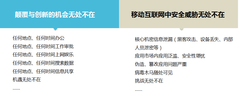 同時(shí),我們也可以看到在BYOD的同時(shí),企業(yè)的機(jī)遇和挑戰(zhàn)也是并存的:移動(dòng)化已經(jīng)成為未來企業(yè)信息建設(shè)的重要趨勢(shì),眾多IT廠商紛紛推出移動(dòng)業(yè)務(wù)解決方案。在滿足企業(yè)移動(dòng)需求的同時(shí),也面臨著如下挑戰(zhàn):