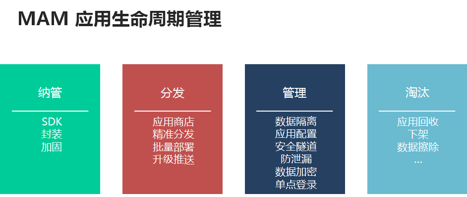移動(dòng)應(yīng)用生命周期管理包括移動(dòng)應(yīng)用納入管理、應(yīng)用分發(fā)、應(yīng)用管理、應(yīng)用淘汰四個(gè)階段: