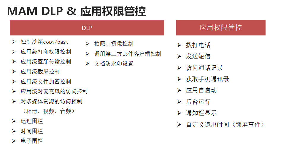 移動(dòng)應(yīng)用的管理,同時(shí)提供了DLP(數(shù)據(jù)防泄漏)機(jī)制,以防止移動(dòng)終端設(shè)備泄漏敏感數(shù)據(jù):