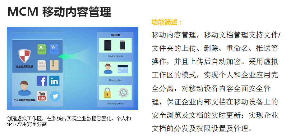 MCM:移動(dòng)內(nèi)容管理,移動(dòng)文檔管理支持文件/文件夾的上傳、刪除、重命名、推送等操作,并且上傳后自動(dòng)加密。采用虛擬工作區(qū)的模式,實(shí)現(xiàn)個(gè)人和企業(yè)應(yīng)用完全分離,對(duì)移動(dòng)設(shè)備內(nèi)容全面安全管理,保證企業(yè)內(nèi)部文檔在移動(dòng)設(shè)備上的安全瀏覽及文檔的實(shí)時(shí)更新;實(shí)現(xiàn)企業(yè)文檔的分發(fā)及權(quán)限設(shè)置及管理。