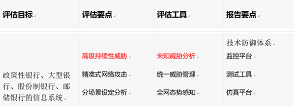 【針對安全的部分,文件要求】政策性銀行、大型銀行、股份制銀行、郵儲銀行還要針對高級持續(xù)性威脅、精準(zhǔn)式網(wǎng)絡(luò)攻擊進(jìn) 行安全評估,對威脅和攻擊進(jìn)行分類場景設(shè)定,有針對性的排查系統(tǒng)漏洞、分析脆弱性,形成應(yīng)對此類攻擊的防護(hù)措施專項(xiàng)評估報(bào)告。