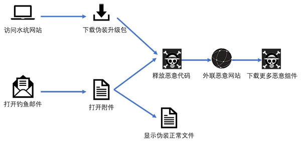 水坑攻擊:當(dāng)訪問者訪問互聯(lián)網(wǎng)上的鏈接時,有可能會訪問到水坑網(wǎng)站,如偽造的某銀行的官網(wǎng),該網(wǎng)站會提示瀏覽器端的FLASH組件需要更新,此時訪問者由于對該銀行的信任而下載偽裝的升級包,升級包下載完成之后,會像正常的升級包一樣在客戶端進(jìn)行安裝,而該文件在后臺則會釋放惡意代碼,惡意代碼會外聯(lián)惡意網(wǎng)站并取得聯(lián)系,外部的APT攻擊組織接收到信息后,則會遙控下載更多的惡意組件,并對企業(yè)內(nèi)部網(wǎng)絡(luò)進(jìn)行攻擊、信息收集,進(jìn)而造成企業(yè)重大損失。