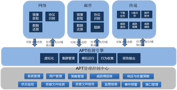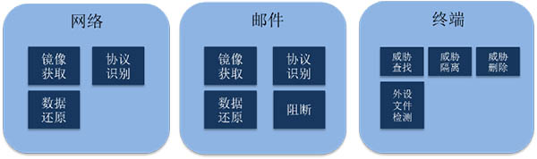產(chǎn)品全面覆蓋網(wǎng)絡(luò)、郵件、終端三個不同的渠道,全面檢測APT攻擊,并進(jìn)行威脅協(xié)同處理;