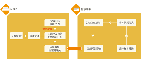 ? ? ? 系統通過關鍵字、自然語言識別等技術對網絡外發的數據進行分類分級的管控,根據策略對數據進行審計、提醒、審批、阻斷等不同級別的防護。
