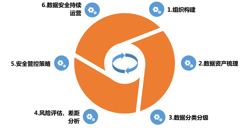 數據安全治理建設共包括六個實踐步驟,六個步驟形成完整的數據安全保護建設閉環,建設流程是一個系統的、持續的改進過程,該流程可以定期輪詢執行,確保數據安全治理建設持續更新,數據安全管理處于最佳狀態。